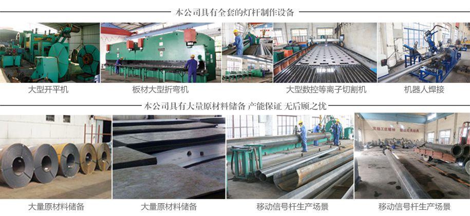 主杆选用优质钢材,经大型剪板机下料,板材大型折弯机折弯成型后焊接、校直、热镀锌、喷塑。可根据用户要求量身定做。